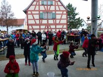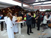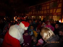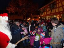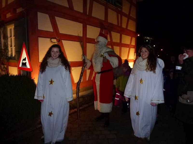 Begleitet von zwei ganz in Weiß gekleideten Weihnachtsengeln stapfte der Nikolaus über den Vorplatz des Büchnerhauses. Schnell war er von Kindern umringt, schließlich hatten sie diesen Moment schon den ganzen Tag herbeigesehnt. Eine kleine Ewigkeit schien zu vergehen, bis er endlich seinen Geschenkesack öffnete und jedem der Kleinen ein kleines Präsent in die ausgestreckten Hände legte. Freudestrahlend rannten die Kinder sogleich davon, um sich gemeinsam mit Eltern, Verwandten und Freunden an der Gabe zu freuen.