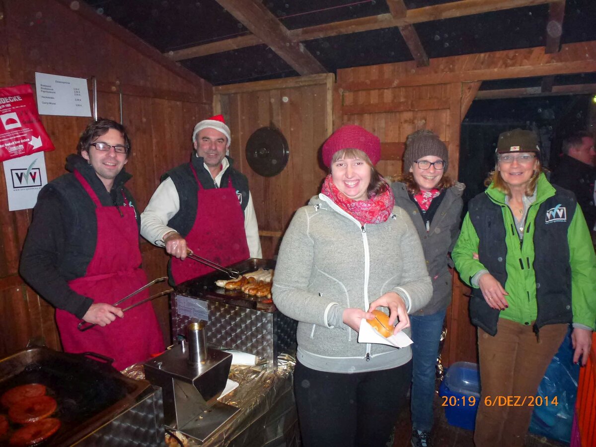 Da jedoch am Zielort ein warmes Buffet auf Abnehmer wartete, ging es schließlich dann doch recht zügig weiter in Richtung Bürgerhaus Wolfskehlen. In einer kurzen Ansprache bedankte sich der 1. Vorsitzende Dieter Knebel für den Einsatz beim Weihnachtsmarkt. Er machte deutlich, dass ohne engagierte Helferinnen und Helfer diese Traditionsveranstaltung des VVV nicht durchführbar sei. Die Helfer hätten somit auch einen erheblichen Anteil am guten Ergebnis des 32. Weihnachtsmarktes, bei dem sich erneut Spenden von insgesamt 2.200 Euro ergaben, die inzwischen auch bereits an die ausgewählten Gruppen übergeben wurden. Dieter Knebel gab auch noch Hinweise auf weitere Veranstaltungen des VVV im Jubiläumsjahr 2014 wie zum Beispiel die Theaterfahrt am 22. Juni und als besonderen Höhepunkt die Verpflichtung der „Simon und Garfunkel Revival Band“ für ein Gastspiel am 23. August in der Christoph-Bär-Halle.