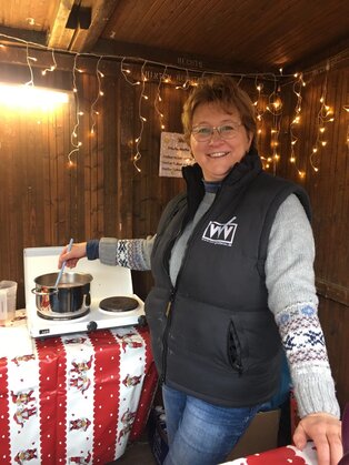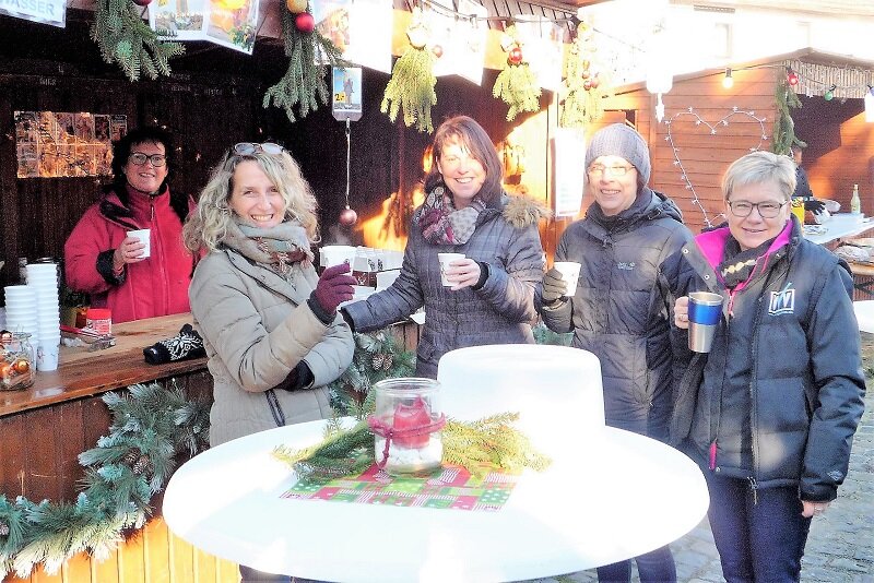 Eine der heißbegehrten Zutaten eines Weihnachtsmarktes ist auch der Glühwein, der inzwischen in vielen Varianten zu haben ist. Fröhliche Damen vom VVV schenkten das wärmende Getränk aus, auch in alkoholfreier Version als Kinderpunsch. „Früher hatten wir das Glühwein-Monopol“, erzählte Elke Halla fröhlich. „Heute gibt es weniger Stress.“ Das war die positive Seite von vielen weiteren Anbietern, zu denen auch die Fußballer gehören. Die boten mit ihrer Partymusik am Stand eher ein Kontrastprogramm zu den besinnlichen Weihnachtsklängen, und verteilten neben Glühwein auch geile Nüsse (Nusslikör) statt Elfmeter.